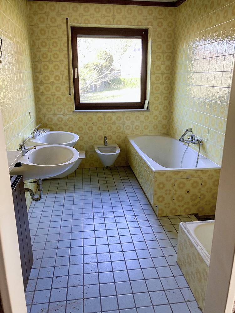 Aus dem Hauptbad, welches täglich benutzt wird, wurde eine kleine Wohlfühloase. Das bestehende 70er-Jahre-Bad musste komplett neu gestaltet werden. Alle Fliesen an den Wänden und am Boden wurden entfernt und durch neue, zeitgemäße Beläge ersetzt. Auch alle Sanitäranlagen wie die Waschtische, Badewanne und Duschkabine wurden komplett demontiert.