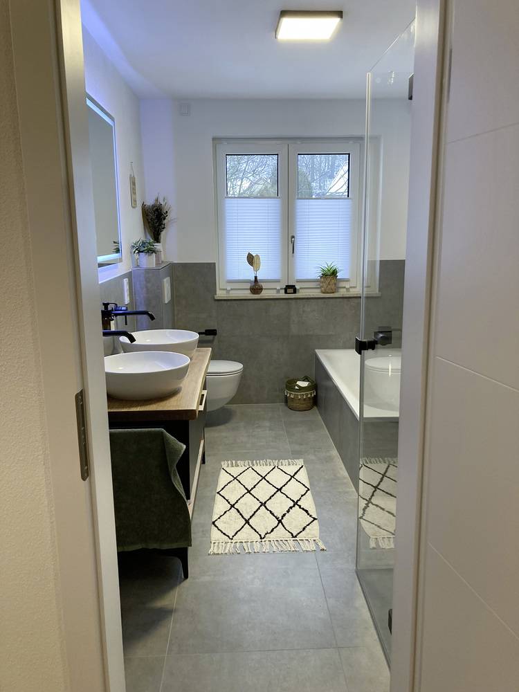 Bei dem Objekt handelte es sich um ein Einfamilienhaus mit Baujahr 1970. Im Haus befinden sich ein Haupt- und ein Gästebad, beide ca. 7 m² groß, die zuvor noch nie renoviert worden waren. Ausstattung und Optik waren veraltet und überholt. Beide Bäder wurden komplett neu gestaltet, um mehr Komfort und Funktionalität zu bieten. Beim Duschbereich legten die beiden Hausbesitzer großen Wert auf eine barrierefreie Gestaltung, da es zum einem chic aussieht und zum anderen für alle Lebensphasen geeignet ist.