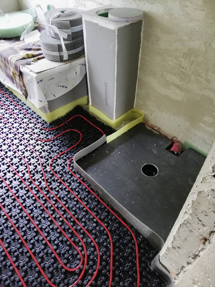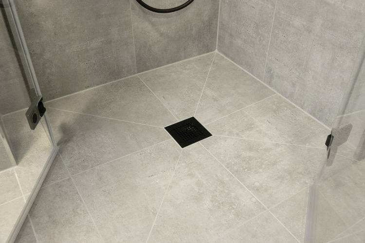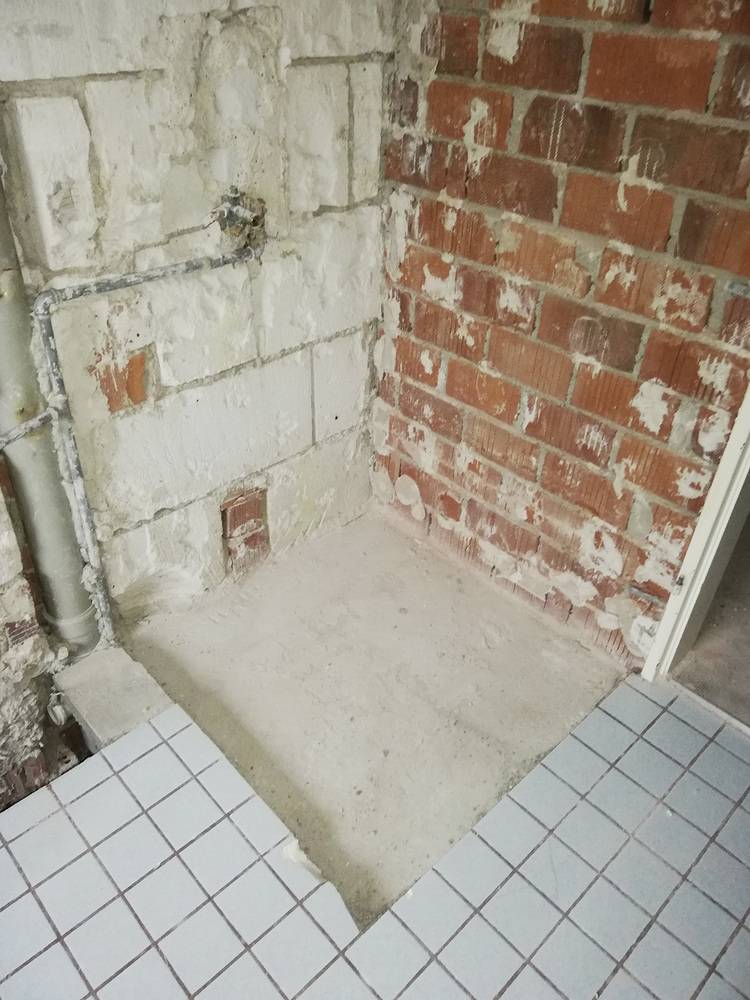 Um einen bodenebenen Duschbereich zu realisieren, musste die tiefe Duschwanne weichen. Der Boden wurde ausgenommen und mittels Estrich oder Ausgleichsmasse wurde der Duschbereich für die Einbauhöhe des Boards und den mittigen Ablauf vorbereitet. Anschließend konnte das Duschplatzsystem installiert werden. In diesem Fall handelte es sich um das extraflache Kermi-Komplett-Duschboard E65 mit bereits werkseitig eingedichtetem Ablauf, das sich durch seine sehr niedrige Einbauhöhe für den Renovierungsbereich eignet.