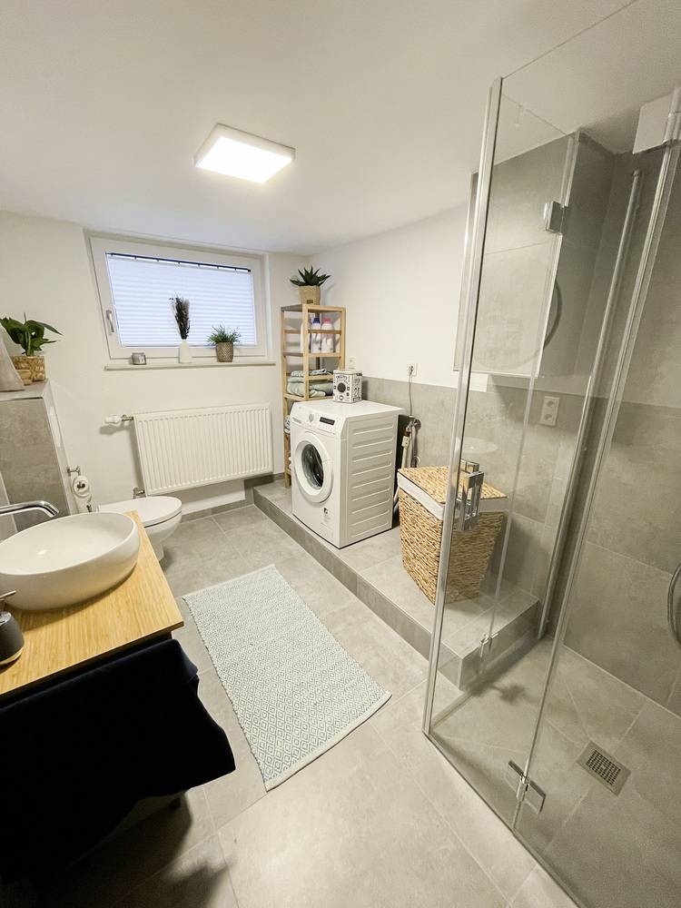 Das zweite Bad des Hauses wurde ebenfalls komplett renoviert. Es entstand ein vollwertiges Bad, das sowohl von Gästen als auch als Ausweichbad genutzt werden kann. Dem Wunsch der Hauseigentümer folgend ist das Bad funktionell, es bietet z. B. auch Raum für eine Waschmaschine und einen Wäschekorb.