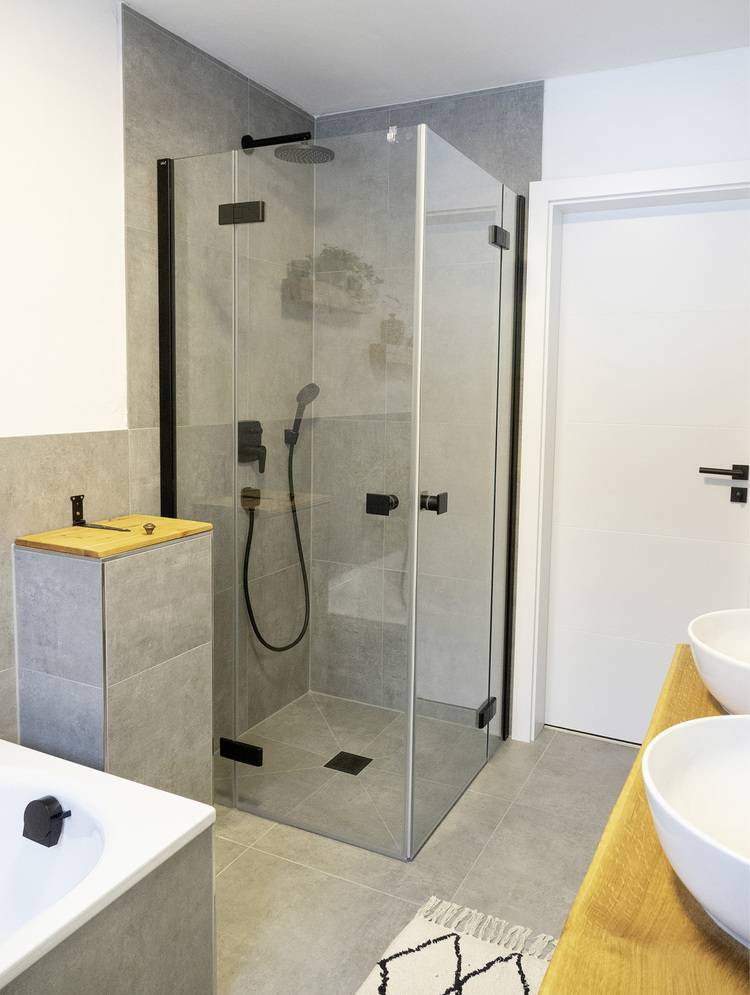 Die Hauseigentümer wünschten sich eine moderne und barrierefreie Duschlösung. Die Wahl fiel auf einen Pendeltüren-Eckeinstieg mit Festfeldern der Beschlagserie Mena des Anbieters. Die Pendeltüren lassen sich nach innen falten, das sorgt für Einstiegsfreiheit und eine praktische Raumersparnis, denn der Duschbereich kann als zusätzliche Fläche im Bad mitbenutzt werden. Das Festfeld wurde maßlich an die Vormauerung des Wäscheschachtes angepasst, um somit einen optimalen Einstieg zu erhalten. Mit Oberflächen in Schwarz soft ist die Duschkabine ein moderner und markanter Hingucker. Die Abdeckung des bodeneben begehbaren Duschplatzsystems wurde passend dazu ebenfalls in Schwarz soft gestaltet.