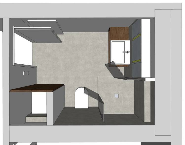 Bauen im Bestand ist meist mit Überraschungen verbunden. So auch hier: Beim Abriss und Entkernen stellte sich das Bad als Wundertüte heraus. Es zeigte sich, dass die Verkofferungen weitgehend hohl waren, durch den Abriss wurde sogar noch Platz hinzugewonnen! Die Detailplanung wurde daraufhin natürlich mit Freuden an die veränderten Bedingungen angepasst.