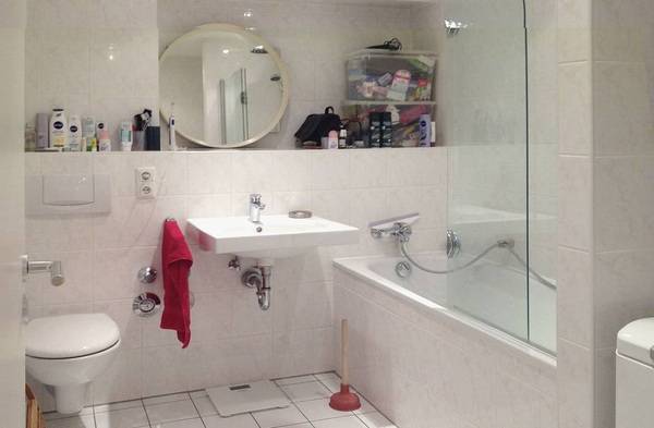 Auch das gibt es: ein zu renovierendes Bad, in dem nichts Erhaltenswertes vorhanden ist. Der Raum von etwa 6,5 m² Größe war, wie früher üblich, rundum raumhoch gefliest. Die Wanne ist von den Kunden ausschließlich zum Duschen benutzt worden – sie sollte ausgebaut werden. Zudem waren WC und Waschtisch an der Kopfwand nebeneinander angeordnet. Beim Betreten des Raums fiel der Blick also zuerst auf das WC – und dann gleich nach rechts auf die Waschmaschine, die offen in einer Nische stand. Auch sie sollte aus dem Blickfeld verschwinden. Durch einen Schacht, Unterzüge und mehrere Vorwände war das Bad zudem ziemlich verbaut, trotzdem gab es kaum Stauraum. Das sollte sich aber ändern.