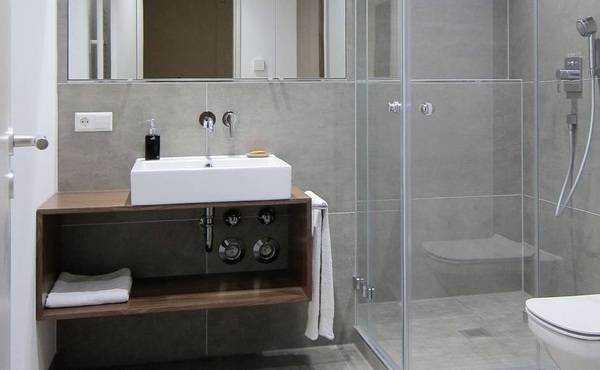 Die Wohnung liegt im ersten Obergeschoss, die Dämmung auf der Decke war nicht besonders hoch. Daher gab es – wie so oft im Bestand – keine ausreichende Aufbauhöhe und damit keine Möglichkeit, eine bodenebene Dusche einzubauen. Wir mussten die Duschfläche also auf ein Podest setzen, hier war dafür eine Höhe von 10 cm erforderlich. Ein Unterschreiten dieser Höhe bei einem Podest ist meiner Meinung nach normalerweise auch dann nicht empfehlenswert, wenn es technisch möglich wäre. Ein Höhenunterschied von 10 cm wird als Stufe wahrgenommen, ein Absatz von beispielsweise nur 4 cm ist eine Stolperkante! Die Duschabtrennung hat durch den Eckeinstieg eine komfortable Öffnungsbreite und verhindert zuverlässig den Wasseraustritt.