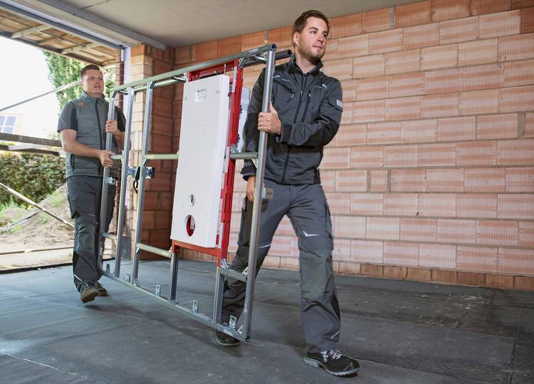 Ist die Installationswand fertig, wird sie je nach Größe im Ganzen oder in transportfähige Teile zerlegt zur Baustelle gebracht. Dort wird sie dann nur noch ausgerichtet und am Baukörper befestigt. Die benötigte Arbeitszeit und speziell die Dauer der Anwesenheit der Handwerker auf der Baustelle reduzieren sich so um ein Vielfaches – auch schon bei einer einzigen Badinstallation.