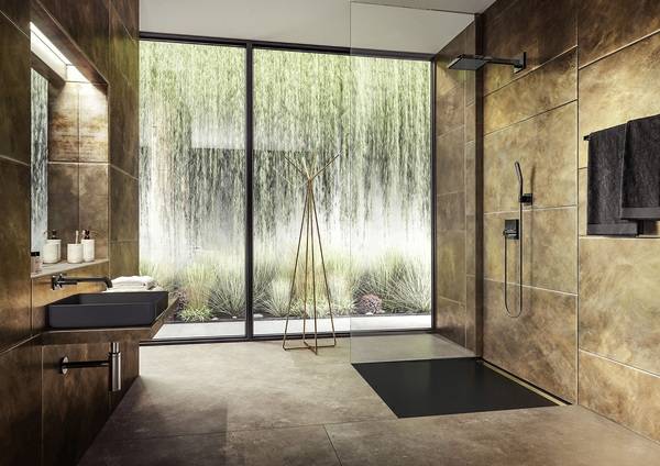 Passende und sehr exquisite Farbtupfer zum dramatischen Schwarz-Look sind glänzende oder matte Oberflächen in jedem erdenklichen Finish, sei es für die Armatur oder die Rinnenabdeckung in der bodengleichen Dusche. Wer Wert auf Außergewöhnliches und Edles legt, darf sich mehr denn je auf gebürstete und polierte Metalltöne wie Rosé- bzw. Rotgold, Messing, Kupfer, Goldoptik oder aber Platin freuen.