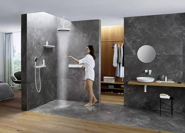 Sinnlicher Hochgenuss ist ebenfalls bei den Duschen angesagt. Deckenbrausen, unter denen man wie im Regen stehen kann, sind aus dem Bad nicht mehr wegzudenken. Manchmal verzaubern sie mit Licht und Duft und sehen aus wie ein Mond (z.B. Aquamoon von Dornbracht). Zudem düst das Wasser überall aus der Wand – neuerdings sogar aus einer praktischen Ablage (Hansgrohe Rainfinity).