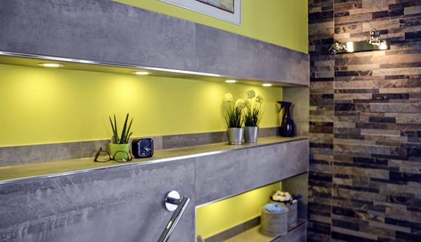 Zur Abrundung und Inszenierung des Bades gehört noch das Element Licht. Deckenleuchten sollten nur in der Duschzone für ausreichend Helligkeit sorgen – dazu wurde die abgehängte Decke in dem Bereich vorgesehen. Neben dem Funktionslicht am Spiegelschrank sorgen diverse Wandleuchten für ein ausgeglichenes und angenehmes Lichtszenario im Raum. Kleine LED-Spots in den Nischen setzen feine Akzente. Das automatisch gesteuerte Nachtlicht im Bereich des WCs wurde vom Kunden zunächst infrage gestellt, ist aber mittlerweile ein sehr willkommenes Ausstattungsmerkmal.