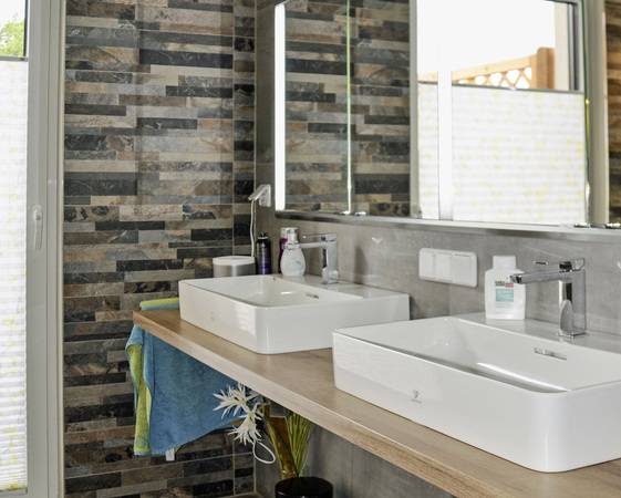 Die Vorwand für den Doppelwaschtisch wurde deckenhoch gestaltet, um Platz für Einbauspiegelschränke zu schaffen. Eine deckenhohe Fliesengestaltung führt zudem zu mehr Ruhe im Raum. In der Ausrichtung wurde die Linie der WC-Vorwand aufgenommen. Das schafft Aufgeräumtheit und Ruhe im Raum. Durch einen geschickten Fugenschnitt unterstützt, führt das zu einer optisch perfekten Inszenierung. Beide Porzellanbecken ruhen auf einer hellen Holzplatte mit ausreichend Abstellflächen. Die filigranen Waschplätze aus Saphirkeramik (Laufen) werden dem Anspruch einer hochwertigen Badgestaltung gerecht.
