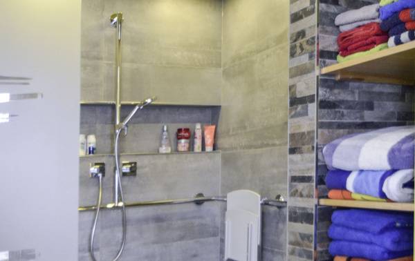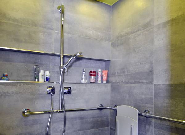 Die hübsche Reling läuft über Eck und sorgt für Sicherheit im Sitzen und im Stehen, selbst an der integrierten Brausestange darf man sich festhalten. Um nicht die Bewegungsfläche für barrierefreie Duschplätze zu unterschreiten, war es leider nicht möglich, eine gemauerte Sitzbank vorzusehen. Ein Klappsitz erfüllt jetzt den gleichen Zweck.
