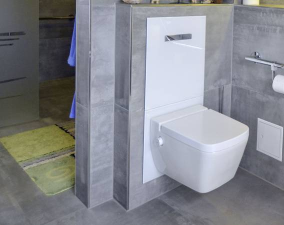 Für alle Badnutzer sinnvoll – und in der DIN auch erwähnt – ist die Möglichkeit, das WC in der Höhe variabel verstellbar auszuführen. Dazu gibt es mehrere Möglichkeiten. Im Stil der Einrichtung und der Liebe der Bauherren zu gutem Design geschuldet, wurde ein System ausgesucht (Tecelux von Tece), das neben der Höhenverstellung über eine Näherungselektronik und Geruchsabsaugung verfügt.