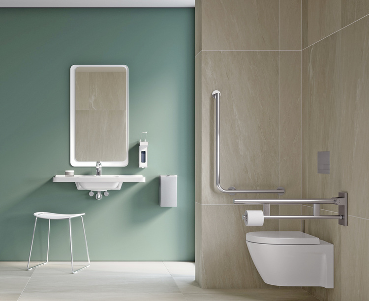 Statt der üblichen vier Befestigungspunkte werden mit der Steck-Rast-Verbindung nur noch drei Rosetten benötigt. Vorkonfigurierte Produkte erübrigen das nachträgliche Ergänzen von einzelnen Produktfunktionen und überzeugen durch technische Details: So verfügen beispielsweise die Stützklappgriffe über eine wartungsfreie Bremse. Ein definierter Anschlag verhindert, dass der Stützklappgriff an die Wand schlägt.