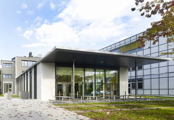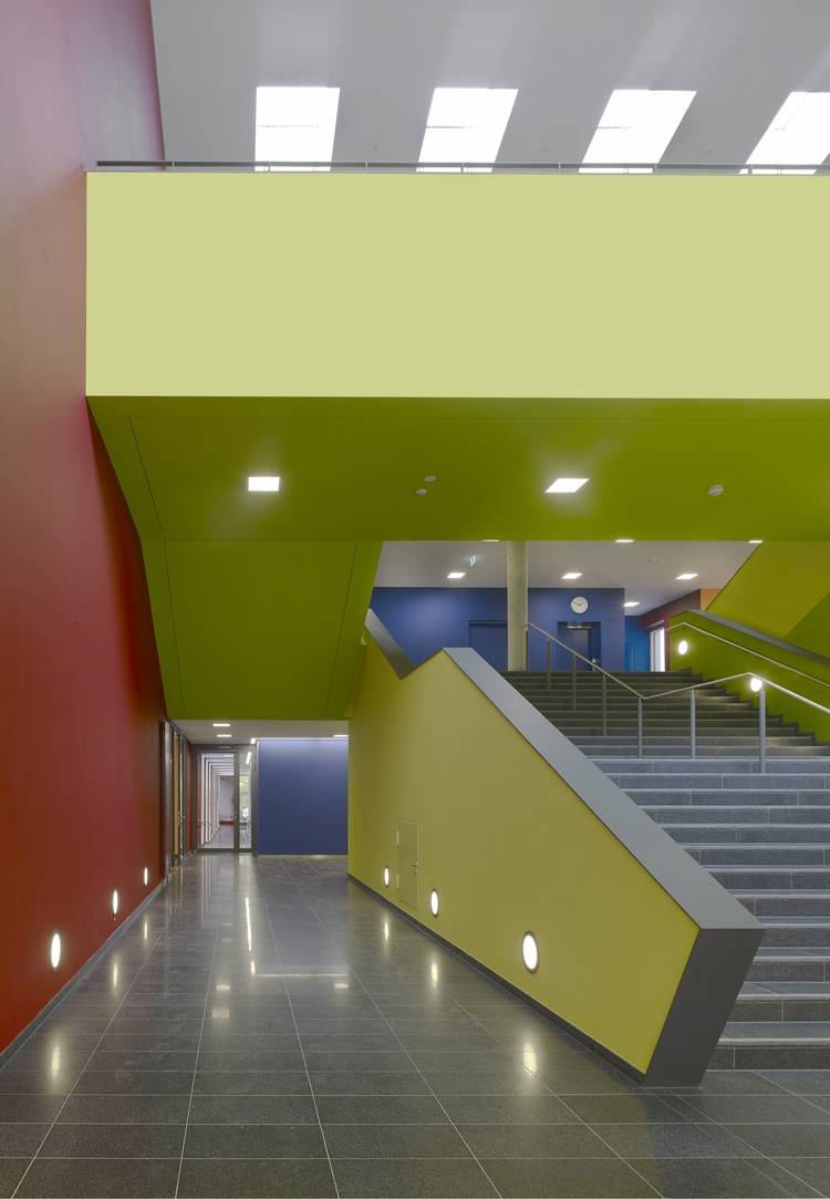 Die Franz-Böhm-Schule im Frankfurter Stadtteil Ginnheim vereint Berufs- und Fachoberschule unter einem Dach. Mit der besonderen Ausrichtung auf die Bereiche Wirtschaft und Verwaltung werden hier überwiegend kaufmännische Ausbildungen angeboten. Die Schule besteht aus vier Gebäudeteilen, von denen drei unmittelbar aneinander grenzen. In den vergangenen Jahren wurde die Schule umfassend modernisiert. So entstand bereits im Jahr 2014 ein großzügiges und multifunktional nutzbares neues Mensagebäude (Bauteil B). 2018 folgte ein weiterer Neubau (Bauteil A), der einen Teil der Unterrichtsräume aufnimmt. Ein Bestandsgebäude aus den 1970er Jahren (Bauteil C) ergänzt den Komplex mit weiteren Unterrichtsräumen. „Bei den Neubauten bestand der planerische Anspruch darin, einprägsame, nicht alltägliche Räume für heranwachsende Menschen zu schaffen, die sehr gerne benutzt werden und dabei den Vandalismus deutlich reduzieren“, erklärt Marcus Schmitt, planender Architekt. Dies spiegelt sich unter anderem in einem kräftigen Farbkonzept wider.