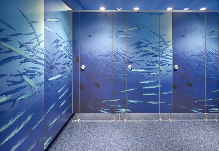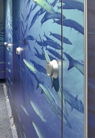 In der öffentlichen Ausschreibung für die Ausstattung der Sanitärbereiche überzeugte die Schäfer Trennwandsysteme GmbH. Das Unternehmen aus Horhausen (Westerwald) lieferte WC-Trennwände des Typs EF-3 sowie dazu passende Wandverkleidungen des Typs WV13 für die beiden Sanitärräume des Neubaus. Es handelt sich um acht Kabinen für Schüler sowie zehn Kabinen für Schülerinnen. Insgesamt wurden 90 beziehungsweise 73m2 Wandverkleidung verbaut. Die Räume erhielten zudem nachträglich Spiegel, die flächenbündig in die Platten eingelassen wurden. Ferner wurden sowohl die WC-Trennwände als auch die Wandverkleidungen mit dem Motiv einer Unterwasserwelt bedruckt. „Die Intention dieser Gestaltung war, einen Innenraum derart zu gestalten und im positiven Sinne zu ‚verfremden‘, dass ein völlig neuer und ungewohnter Raumeindruck entsteht“, erklärt Schmitt.