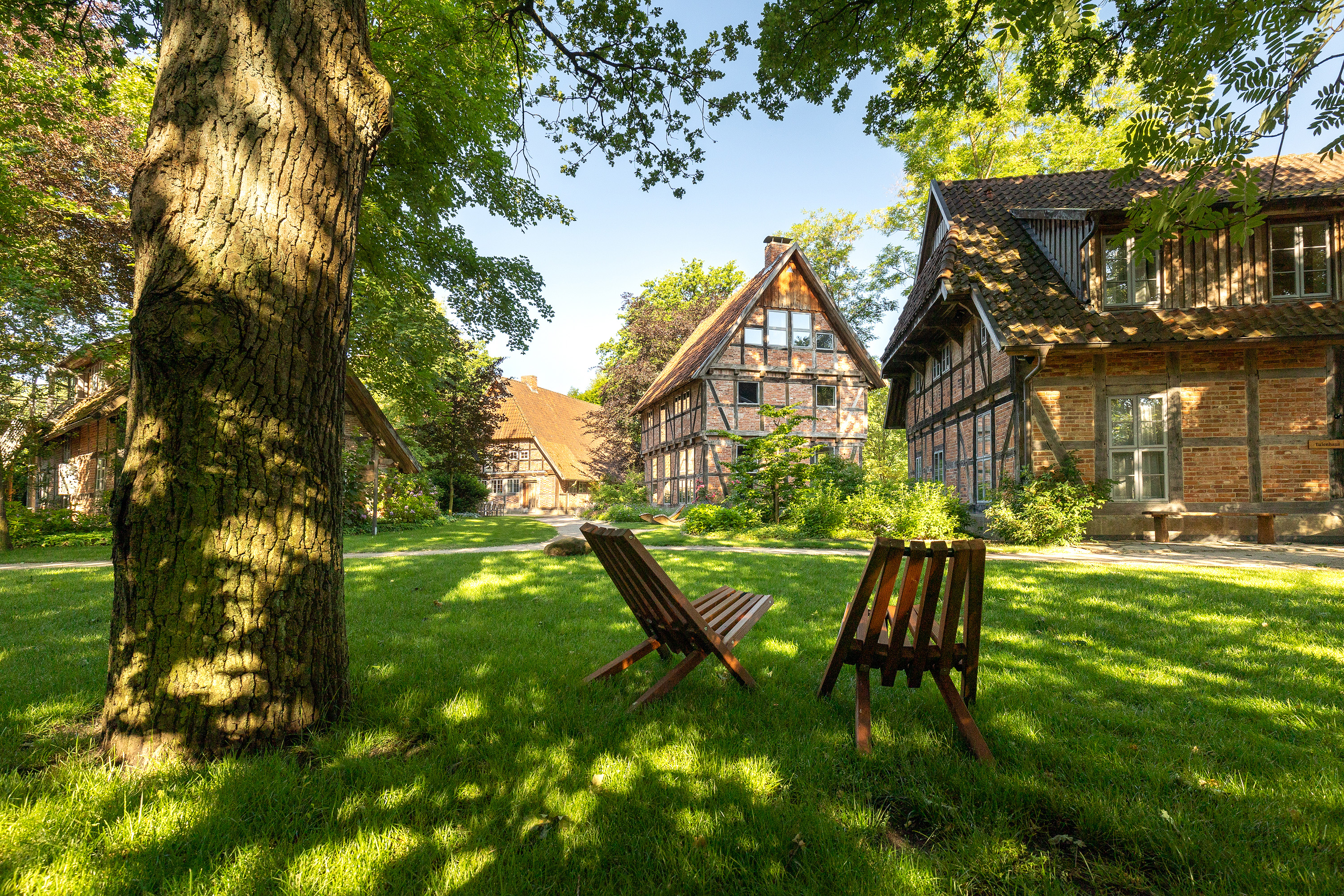 Die alten Bauernhäuser wurden in den 1980er Jahren an ihrem ursprünglichen Standort abgetragen und im 10.000 Quadratmeter großen Naturgarten neu errichtet. Diese architektonische Translokation verleiht der Anlage eine authentische Patina und das Flair eines kleinen Freilichtmuseums. Zwei neu errichtete Bettenhäuser fügen sich mit ihrer bewusst reduzierten, ländlich-asketischen Anmutung behutsam in das historische Ensemble ein. Der Ort vermittelt das Gefühl, ganz allein in der Natur und „aus der Welt gerückt“ zu sein, und bleibt doch subtil mit der dörflichen Nachbarschaft verbunden.