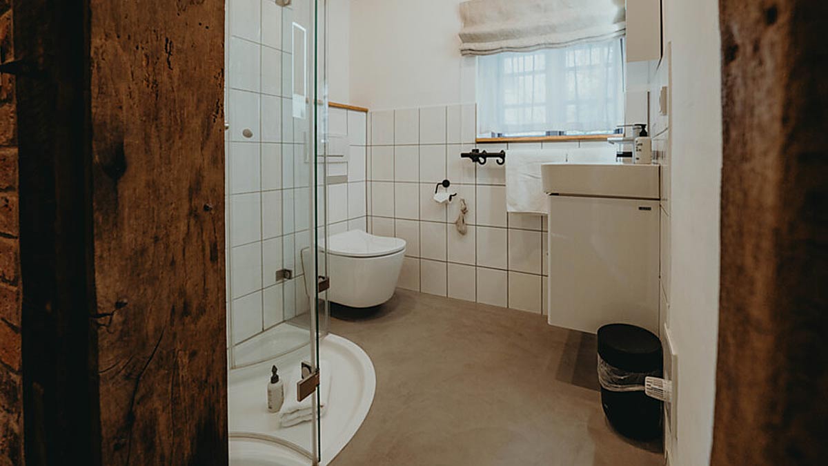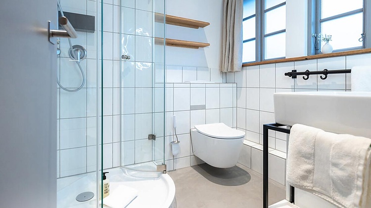 In den Bestandsgebäuden befinden sich 18 Gästezimmer. Zwei Bäder wurden neu gebaut, die übrigen modernisiert – mit bewusst erhaltenen weißen Fliesen, ergänzt um Waschtische aus schwarzem Metall und Eichenholz. Sie wurden technisch aufgewertet und mit Dusch-WCs von Toto ausgestattet: dem Washlet RW in größeren Räumen und den WC-Modellen RP und GP in kleineren Räumen.