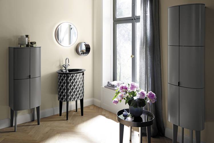 Für das Gästebad-Ensemble von Diva 2.0 bietet Burgbad eine Furnieroberfläche mit Rautenstruktur in Anthrazit an, die einen besonders schönen plastischen Effekt ergibt. Der illusionistische 3-D-Effekt des Furniers Grid Wood wird durch geometrische Figuren erreicht, die in einem aufwändigen Verfahren zu einem so genannten rekonstruierten Echtholzfurnier zusammengesetzt werden. Entworfen wurde das im Stil alter Intarsien-Technik angelegte Muster vom schwedischen Designer-Duo Front. Füße und Leisten sind hierzu nur in Schwarz kombinierbar und korrespondieren ideal zu dem Schwarz des Waschbeckens und der Abdeckplatte des Schrankes. Auch der eintürige Waschtischunterschrank (Höhe 850 mm, Tiefe 445 bzw. 485 mit Hahnlochbank, Breite 590 mm) weist die charakteristische Ellipsenform von Diva 2.0 auf und ist in einer Version mit Hahnlochbank und in einer noch schmaleren Version für eine Wandarmatur erhältlich.