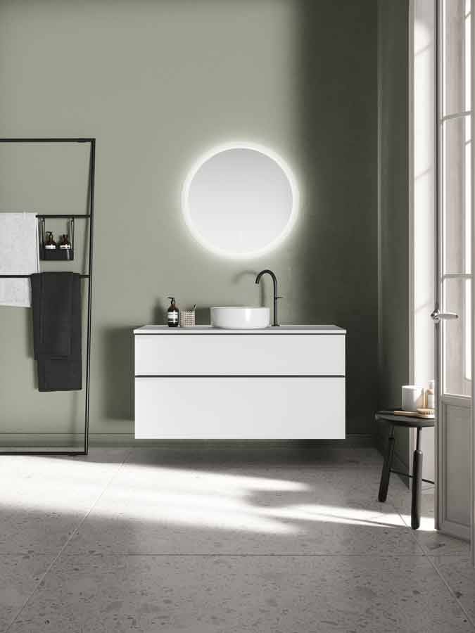 Die neuen Konsolenlösungen erweitern den Gestaltungsspielraum von Eqio um ein Waschplatz-Arrangement. Besonders in Kombination mit den neuen, kreisrunden LED-Leuchtspiegeln (600 mm Durchmesser; 750 und 900 mm Durchmesser mit Spiegelheizung) entsteht ein stimmiges Gesamtbild.