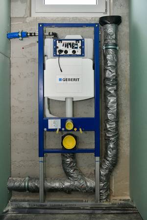 Um den regelmäßigen Wasseraustausch im Neubau zu gewährleisten, entschieden sich Bauherr und Installateur für ein neu entwickeltes Produkt: Geberit Unterputz-Spülkästen mit integrierter Hygienespülung, die in den Mietbädern installiert sind. Die Hygienespülung löst in regelmäßigen Abständen einen Wasseraustausch in den Leitungen aus.