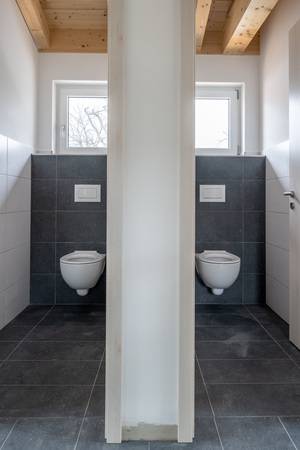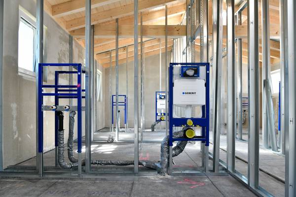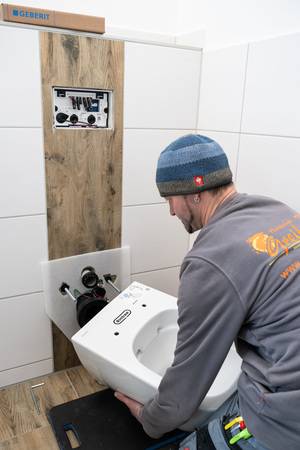 „Nicht nur mit der Installationstechnik, auch mit den Entwässerungssystemen Geberit Silent-db20 und Silent-PP arbeiten wir bei Greif Haustechnik schon lange. Sie gehören für uns fast schon zum Standard bei neuen Bauprojekten“, erzählt der Installateur. Im Erdgeschoss sind die Geberit Silent-db20-Leitungen offen verlegt und bleiben sichtbar. In den Sanitärräumen im ersten Stock wurden Silent-PP-Rohre als Einzelanschlussleitungen verlegt.