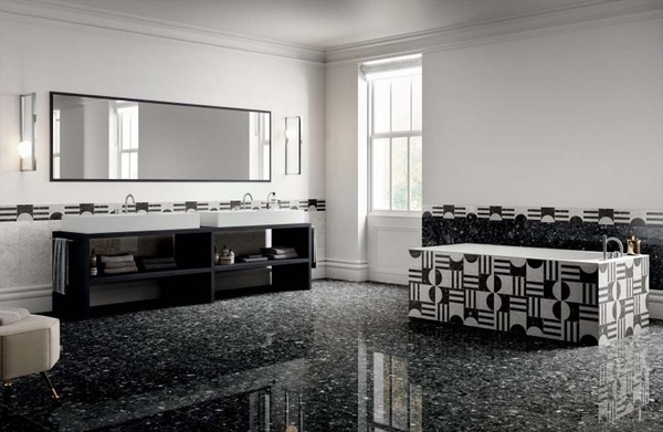 Magmatische und mineralische Kontraste mit schillernden Weißtönen: Die Fliesenkollektion Opulence von Ceramiche Piemme bietet sehr zeitgemäße Dekoreffekte – sowohl durch die abwechselnde Verlegung verschiedener Farbtöne für Böden und Flächen als auch durch die optischen Dekore mit Designs, die im Mäander-Muster der 30er-Jahre oder in Modulen im 70er-Jahre-Stil verlegt werden können.