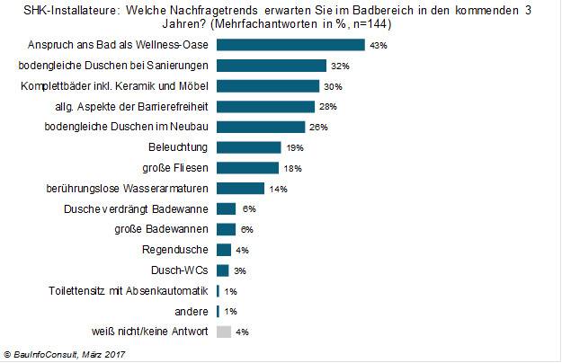 Nach Ansicht vieler SHK-Profis wird ein zentraler Trend dabei der Anspruch sein, das Bad als Wellness-Oase zu gestalten. Diese Entwicklung ist schon seit Längerem am Markt zu beobachten, denn die Einstellung der Endkunden hat sich in den letzten Jahrzenten gewandelt: weg vom Bad als funktionaler Raum, hin zu einem „Wohlfühl-Ort“. Aber auch das Thema bodenebene Duschen ist immer noch en vogue. Dies zeigen erste Vorabergebnisse der BauInfoConsult Jahresanalyse 2017/2018, der zentralen Branchenstudie zum deutschen Baugeschehen.