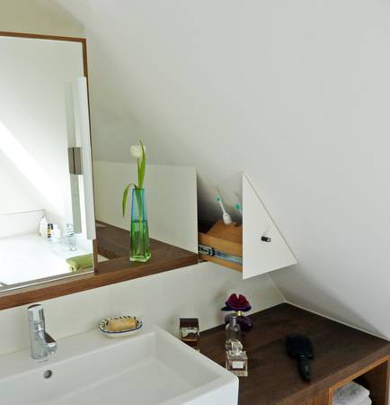 Gerade im Bad unterm Dach fehlt es an Wänden, um Schränke für Utensilien unterzubringen. Dabei gibt es genügend ungenutzte Fläche unter den Dachschrägen – entscheidend ist hier vor allem die Drempelhöhe. Die Drempelhöhe, oder auch Kniestock genannt, ist die Höhe, wo der sogenannte Drempel – Balken auf der Außenwand – die Sparren abfängt – also im Innenbereich der Punkt, wo Dachschräge und Hauswand sich horizontal treffen. Im Normalfall liegt diese zwischen 60 bis 120cm. Je niedriger diese ausfällt, umso schwieriger wird eine sinnvolle Nutzung. Liegt diese unter 80cm, wird kaum ein Möbel aus dem Katalog passen – von der Bedienbarkeit und mühevollem Sauberhalten in gebückter Haltung ganz abgesehen. Daher werden diese Flächen leider oft einfach mit einer vorgesetzten Wand geschlossen, um so die Drempelhöhe zu erhöhen – ein riesiger Verlust an Stauraum. Doch unser Beispiel Bild 7 zeigt, dass es mit Kreativität und Tischlergeschick auch anders geht: Hier wurde neben dem Waschtisch der Raum unter der Dachschräge mit einem Auszug für die elektrischen Zahnbürsten sinnvoll genutzt: griffbereit und doch aus dem Blickfeld.