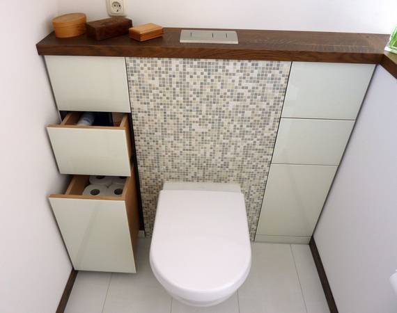 - Bei notwendigen zusätzlichen Wänden – zum Beispiel bei Duschen – den Raum dahinter mit Auszügen nutzen.