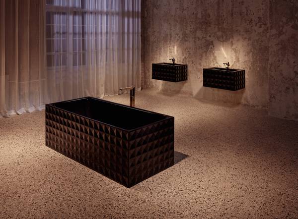 Auf die 1810 x 810 mm große Badewanne abgestimmt ist ein wandhängender Waschtisch, der jetzt ebenfalls in Schwarz gewählt werden kann. Seine Außenseiten zieren dasselbe geometrische Muster – wahlweise mit ein- oder vierreihiger Prägung, sprich mit sichtbarem oder verdecktem Siphon. Der einreihig geprägte Waschtisch ist in den Maßen 825 x 525 x 125 mm erhältlich, der vierreihig geprägte in den Abmessungen 815 x 510 x 420 mm.
