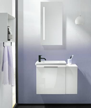 Der Waschtisch ist wie das übrige Programm in den Materialien Glas, Keramik und Mineralguss erhältlich und optional mit einer unter dem Beckenrand integrierten, umlaufenden LED-Beleuchtung ausgestattet. Die Waschtischeinheit für das Mini-Bad gibt es mit oder ohne ein seitlich offenes Fach, sodass sich zwei Breiten von 530 und 715 mm bei einer Tiefe von nur maximal 315 mm und einer Höhe von maximal 520 mm beim Keramik-Waschtisch (540 mm inklusive Beleuchtung) ergeben.