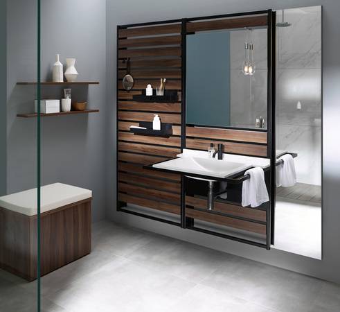 Ein Modul besteht aus einem filigranen, schwarz gepulverten Metallrahmen in zwei Versionen, der flach an der Wand zu befestigen oder mittels Teleskop-Verbindungen frei zwischen Boden und Decke aufzuspannen ist. In ihn können nicht nur schöne Wandpaneele in der Optik einer grob gerasterten Holzlattierung integriert werden, sondern auch Halterungen für Waschbecken (Wandmodul), Schränke, Ablagen, Spiegel, Utensilos oder Kleiderhaken. Die Rahmen sind einheitlich 800 mm breit und 1.760 mm hoch. Beim Wandmodul mit Waschtisch wird die Tiefe von 550 mm durch den metallenen Waschtischträger bestimmt.
