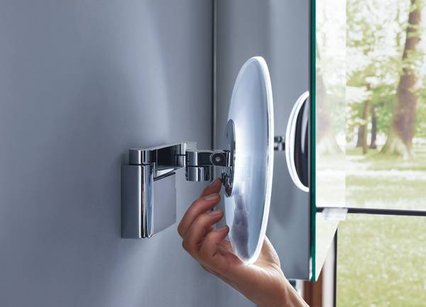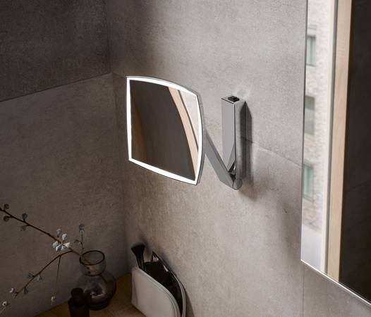 Der Kosmetikspiegel ist mit einer drei- oder einer fünffach vergrößernden Fläche mit einem Durchmesser von 200mm erhältlich. Diese wird von einem ebenso stabilen wie flexiblen Scherengelenkarm mit einer Ausladung von 360mm gehalten. Damit lässt sich der Spiegel etwa nahezu wandbündig zurückklappen und bildet dabei mit der unter dem Arm positionierten Wandhalterung eine kompakte Einheit. Das Vorschaltgerät für die Lichtsteuerung ist beim Direktanschluss im Wandelement sowie bei der kabelgebundenen Version im Steckernetzteil integriert.
