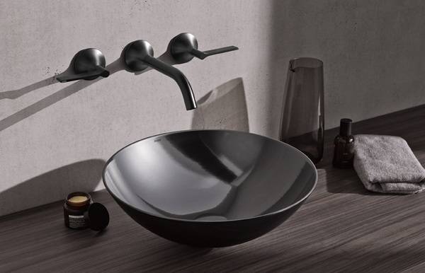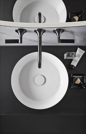 Die neue Oberfläche Bicolor vereint zwei Kontraste: schwarz/ weiss und matt/glänzend. Die Präzision des Überganges der beiden Farben verstärkt die filigrane Beschaffenheit der runden 3mm Becken: Er endet am äusseren, auslaufenden Radius und lässt so die weisse Oberfläche als exakten Rand auch aussen erlebbar werden. Die mattschwarze Aussenfarbe setzt sich auch in den Zubehörkomponenten fort: Distanzring und Wandkonsole werden ebenfalls in mattschwarz geliefert, während die Ventilkappe weiss glasiert ist.