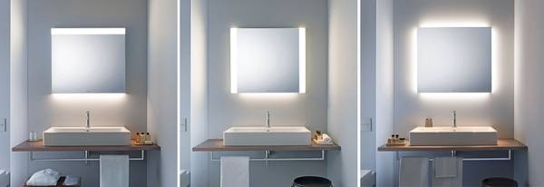 Bei den Spiegelelementen ohne Stauraum stehen drei Lichtprofile zur Auswahl: Vierseitiges Ambiente-Licht, ein Lichtfeld am oberen Spiegelrand oder zwei seitliche Randlichtfelder. Dank moderner LED-Technik entsteht bei der vierseitig umlaufenden Ambiente-Beleuchtung ein sogenannter Wallwasher-Effekt: Dafür sind vier Lichtquellen rückseitig angebracht und ermöglichen eine gleichmäßige Ausleuchtung der Wandflächen rund um den Spiegel. Auch bei den beiden Modellen mit Randlichtfeld kommen LEDs zum Einsatz und es entsteht so eine randlose Lichtquelle. Alle Modelle gibt es analog zu den neuen Spiegelschränken in drei Ausführungen. Die Komfort-Variante des Spiegelelements gibt es zusätzlich mit Spiegelheizung.