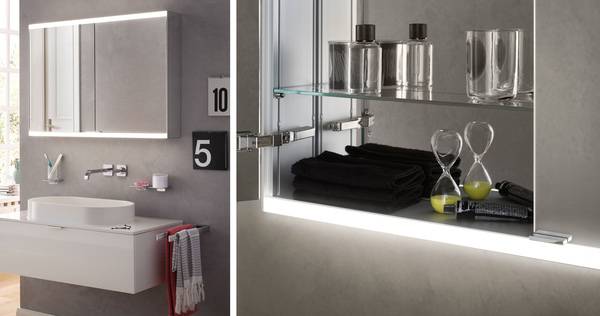 Erkennungsmerkmal der neuen Spiegelschränke im modular aufgebauten Sortiment „Licht und Spiegel“ist das überstehende Lichtfeld am oberen Spiegelrand. Mit über 300 Lux und einer Farbe von 4000 Kelvin sorgt das 60 cm breite Lichtband für eine angenehme Beleuchtung. Lichtband und Schrankkorpus sind seitlich mit satinierten Weißglasabdeckungen eingefasst. Alle Modelle bieten maximalen Stauraum mit einer Tiefe von 15 cm.