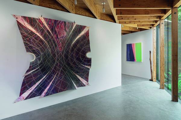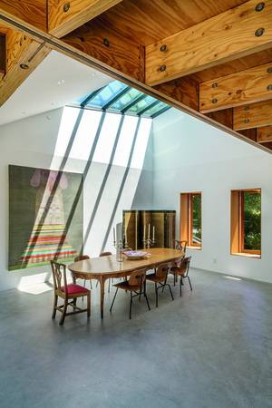 Ein gläserner Weg, der zugleich als private Kunstgalerie dient, verbindet die einzelnen Volumen. Was zufällig aussieht, folgt einem System: dem Verlauf der Sonne, der Position des Baumbestands sowie der gewünschten Nutzung. Auch die verschiedenen Winkel und Formen der miteinander verbundenen gläsernen Fassaden und Dächer aus Kupferschindeln folgen dem Wunsch nach einem perspektivischen Blick in die Landschaft und – über die Oberlichter – in den Himmel.