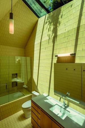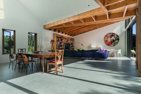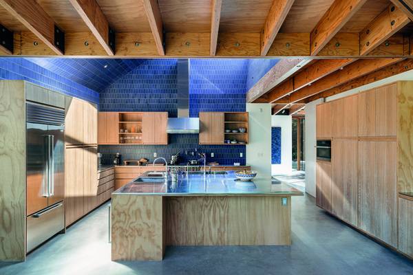Ein polierter Betonboden, einfache Furnierflächen und schlichte, weiße Wände bilden einen neutralen Hintergrund für die Kunstsammlung der Bauherren. Akzente setzen die Fliesen in Blau, Rosa und Gelb in der Küche und in den Bädern. Deren offene, mehrdimensionale Raum-Geometrien verleihen den farbenfrohen Flächen je nach Tages- und Jahreszeit eine andere Atmosphäre.