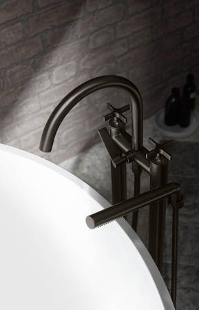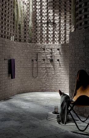 Auf Basis von Entwürfen des New Yorker Architekten Rafael de Cárdenas entwickelte Creative Director Mike Meiré eine Badarchitektur, in der Vaia als verbindendes Element zwischen verschiedenen Stilwelten fungiert. Im Sinne des Interior-Design-Trends Transitional Style wird Vaia in Dark Platinum matt in einem Umfeld voller Gegensätze inszeniert: Inmitten einer organisch anmutenden, kathedralartigen Architektur erscheint Vaia auf einem monolithischen Solitär-Waschtisch, der aus Kuben unterschiedlichen Materials, wie etwa Marmor und Rauchglas, besteht. Mit seiner kantigen Form steht dieser im Kontrast zur Formensprache der Armatur wie auch zum geschwungenen Grundriss der Architektur. Ziegel, eines der ältesten Bauelemente überhaupt, bilden dabei einen spannungsreichen Hintergrund für die seidenmatte Oberfläche Dark Platinum matt.