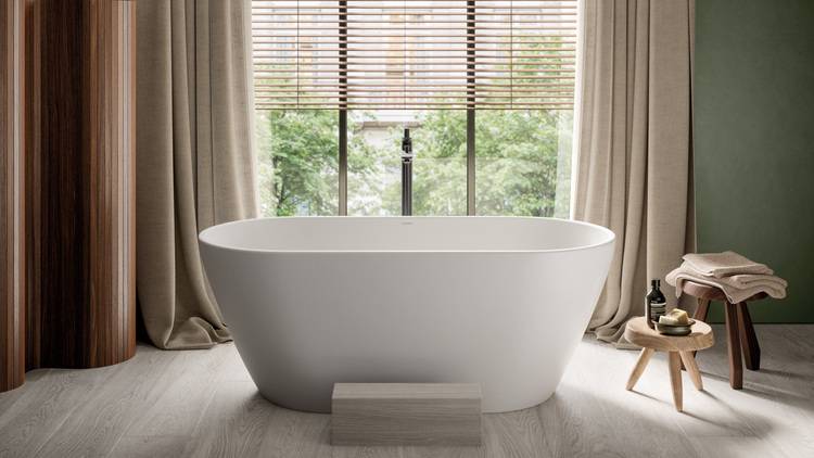 Design im Kleinformat: Die freistehende Badewanne der Serie D-Neo ist ein platzsparender Blickfang, mit den sich auch in kompakten Grundrissen der Traum einer freistehenden Wanne realisieren lässt. Insbesondere in Kombination mit warmen Holzoberflächen und weichen Textilien entsteht eine harmonische Atmosphäre, die Wohnlichkeit ins Bad bringt.