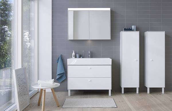 Die passenden Spiegel und Spiegelschränke verfügen über ein 60 mm breites, 300 Lux starkes LED-Randlichtfeld oben. Waschplatzbeleuchtung, Dimmfunktion und Spiegelheizung lassen sich berührungslos steuern. Die seitlich angebrachten Korpusblenden sind passend zur Oberflächenfarbe der Möbel bestellbar und vervollständigen das frische Gesamtbild der Serie.