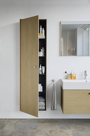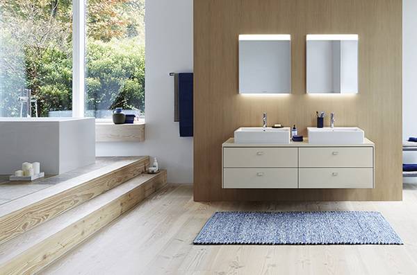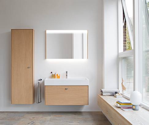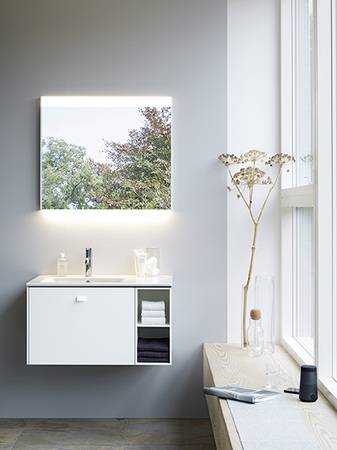 Abgestimmt auf das Design der Möbel bietet Duravit Spiegel in acht Breiten (450 bis 1600 mm) und Spiegelschränke in vier Breiten (600 bis 1200 mm). Auf der Spiegeloberfläche befindet sich das neue Bedienfeld. Hier lassen sich das Hauptlicht, Ambilight und Spiegelheizung berührungslos per Sensor steuern. Außerdem verfügen alle Spiegel über eine neue Farblichtwechsel-Funktion: Bei einer Lichtstärke von mehr als 300 Lux kann die Lichtfarbe stufenlos von 2700 (Warmlicht) bis 6500 Kelvin (Kaltlicht) eingestellt werden. Warmes Licht eignet sich besonders für eine angenehme Atmosphäre, Kaltlicht dient vor allem als Kosmetiklicht. Die Memoryfunktion stellt sicher, dass die gewünschte Lichtfarbe und Intensität bei wiederholter Verwendung nicht nochmals eingestellt werden muss. Ebenfalls neu ist die funktionale Innenorganisation der Spiegelschränke mit Utensilienboxen, einem Board für Accessoires und einer Magnetleiste für alle kleinen Accessoires, wie Schere oder Pinzette.