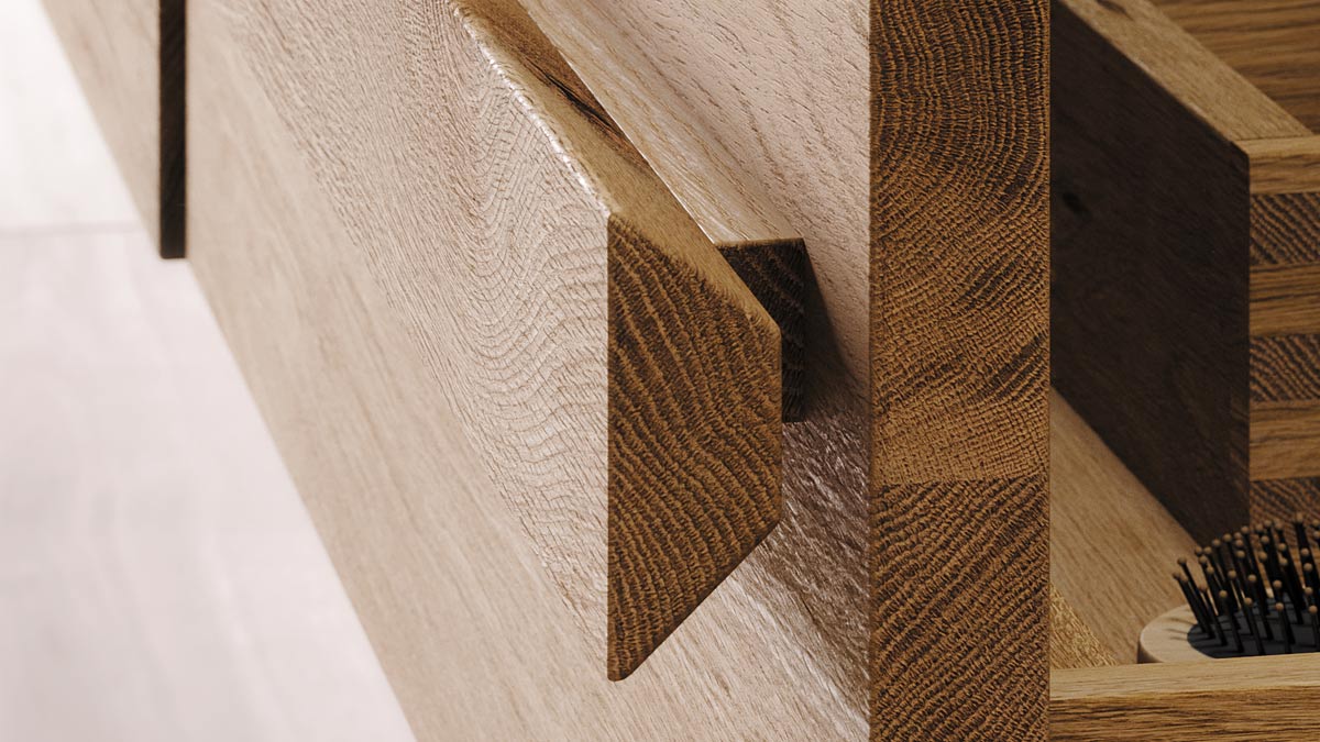 Ocavo überzeugt durch eine klare, reduzierte Formensprache, die dem Raum Struktur und Ruhe verleiht. Die dreidimensionale Korpuskonstruktion verleiht den Möbeln Tiefe, während abgeschrägte Kanten und eine Griffleiste mit beidseitiger Fase für Leichtigkeit sorgen. Alle Korpusse sind aus massivem Holz gefertigt und zeugen von hoher handwerklicher Qualität.