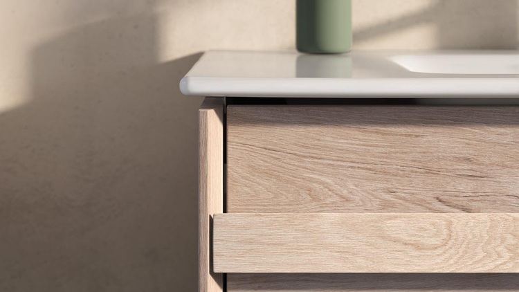 Drei Holznuancen verleihen dem Bad eine jeweils ganz eigene Atmosphäre: Eiche Natur strahlt Wärme und wohnliche Geborgenheit aus, Eiche Hell bringt Leichtigkeit und Frische in den Raum, während Eiche Schwarz mit seiner tiefen Farbgebung für eine moderne, elegante Anmutung sorgt.