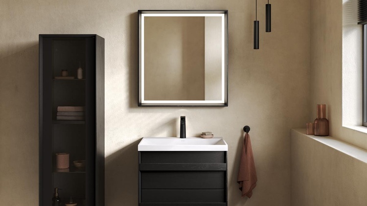 Spiegel und Spiegelschränke mit massivem Holzrahmen runden das Programm ab und fügen sich stimmig in das Gesamtbild ein. Die integrierte LED-Beleuchtung sorgt für eine gleichmäßige, stimmungsvolle Ausleuchtung.