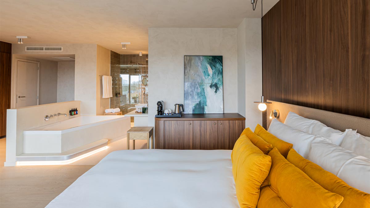 Die Interior-Design-Agentur BLCN Design übersetzte die kreative Vision in ein Interior, das Raum für Leichtigkeit und Inspiration schafft: modern interpretiert, mutig inszeniert und mit einem Auge fürs Besondere. Das Konzept verweist auf Ostende in den 1970er und 1980er Jahren, eine Ära, in der die Stadt zugleich mondän und lässig war, geprägt von sommerlicher Leichtigkeit. Warme Farben, sanft geschwungene Linien und Materialien mit Retro-Charme prägen das Bild vom Eingangsbereich bis in die Hotelzimmer und schaffen hohe Wiedererkennbarkeit.