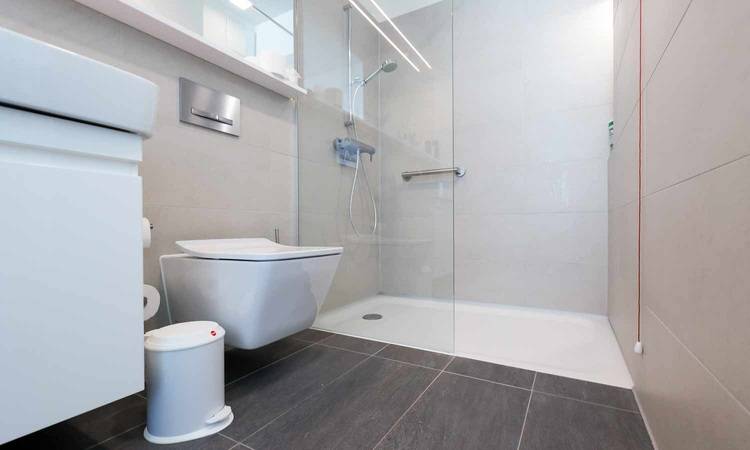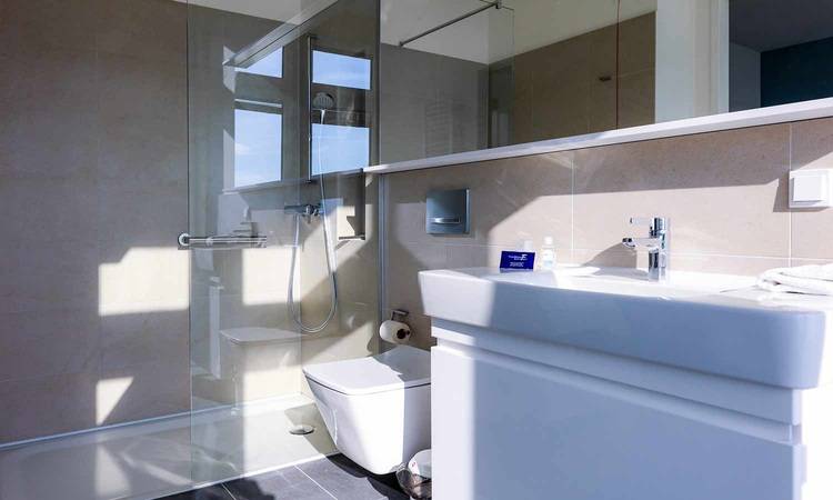 Eingebaut wurden die Duschwannen mithilfe des bewährten Einbausystems Universal von Bette. Das modulare System bietet eine einfache und sichere Montage, flexible Anpassung an bauliche Gegebenheiten, Schutz vor Durchfeuchtung nach DIN 18534-1 und die dauerhafte Revisionsfähigkeit des Duschbereichs. Zudem wird es serienmäßig auch hohen Schallschutzansprüchen gerecht – die Schallbelastung bei der Nutzung beträgt nur 20 dB(A) und erfüllt so die Anforderungen an Schallschutz im Hochbau gemäß DIN 4109/A1 und die erhöhten Anforderungen nach VDI 4100 SST III. Für die Patienten der Strandklinik Boltenhagen bedeutet das zusätzliche Ruhe, die für die Genesung und Erholung wichtig ist.