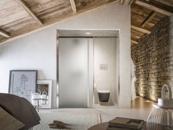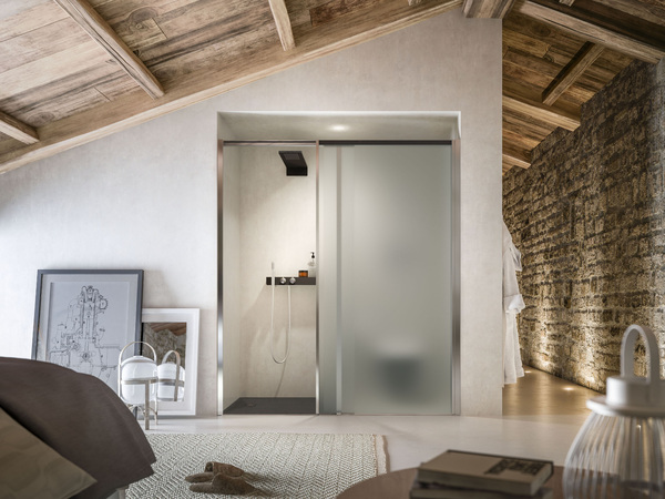 Neu ist auch die ausgestellte Gestaltung mit getrennten Funktions- und Wellnessbereichen, mit einer Gleittür mit Trennelement aus Kristall. Der in der Gesamtlänge des Vertikalprofils der Tür integrierte Griff charakterisiert das gesamte Sortiment und erlaubt eine maximale Öffnung.