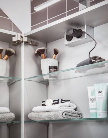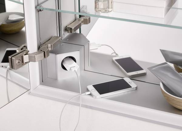 Die Prime- und Prime 2-Modelle sind ab einer Breite von 1.000 mm nun mit einer zweiten Steckdose ausgestattet. Die zweite Steckdose ergänzt die bei allen Modellen grundsätzlich vorhandene Elektrobox mit Steckdose und integrierter Lichtsteuerung. Beide Elemente sind als Ecklösung konzipiert und integrieren sich sowohl vom Platzbedarf als auch farblich harmonisch ins Schrankinnere, zudem lassen sie sich auch bei geschlossener Schranktür nutzen. Ein weiteres Ausstattungsmerkmal der Serie sind die stufenlos verstellbaren Glasablagen und die in das Scharnier integrierten Soft-Close-Dämpfer. Sämtliche Modelle sind dabei als Auf- oder als Unterputzversion sowie wahlweise mit einer verspiegelten oder glasweißen Rückwand erhältlich. Darüber hinaus ist optional auch ein Lichtpaket verfügbar.