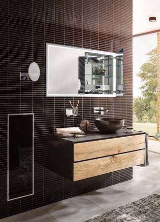 Insgesamt sind 40 Varianten des Lichtspiegelschranks verfügbar, zur Auswahl stehen dabei sowohl Aufputz- als auch Unterputz-Lösungen, mehrere Breiten zwischen 600 und 1.600mm sowie Modelle mit zwei oder drei Türen. Ein charakteristisches Merkmal der Serie ist dabei, dass viele Versionen auch mit asymmetrischen Spiegeltüren erhältlich sind, die sicherstellen, dass das Spiegelbild im Sichtbereich auf einer fugenfreien Fläche wiedergegeben wird.