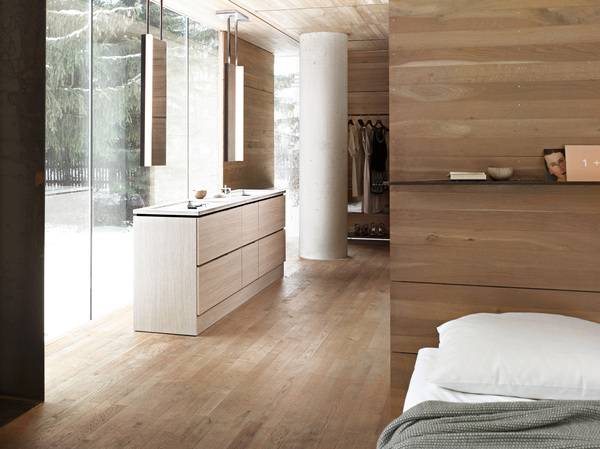 Analysiert man die Abläufe über das Bad hinaus, wird schnell klar, dass im idealen Raumkonzept die Ankleide das Bindeglied zwischen Bad und Schlafzimmer darstellt. Nach der Morgentoilette will man sich anziehen – abends nach dem Entkleiden sich bettfein machen. So führt der optimierte Weg vom Bett ins Bad immer über den Schrankbereich. Geht man nun noch weiter ins Detail, stellt man fest, dass der Waschtisch funktional eigentlich zwischen Ankleide und Bad gehört. Zähne putzen und Gesicht waschen ordnet man dem Badbereich zu.